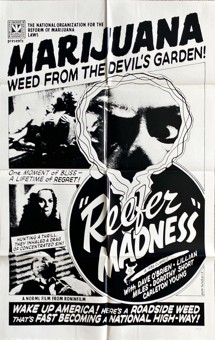Reefer Madness, the 1936 Louis J. Gasnier marijuana marihuana pot weed drug thriller ("marijuana drugs, Weed from the Devil's garden!"; "One moment of bliss, a lifetime of regret!"; "Hunting a thrill, they inhaled a drag of concentrated sin!"; "Wake up America! Here's a roadside weed that's fast becoming a national high-way!"; "Women cry for it, men die for it!"; "What actually happens!"; "Never before such exciting frankness"; "A Daring Theme!"; "Dope-created ecstasy avalanching into frightful perversions"; "Makes Beasts of Men & Women"; "Adults only")