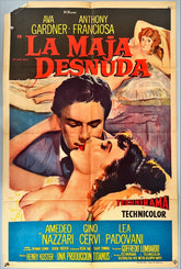 This is an original vintage Mexican one sheet poster (measuring approximately 27x41 inches) for La Maja Desnuda (The Naked Maja), the 1958 historical drama starring Ava Gardner and Anthony Franciosa, directed by Henry Koster. The artwork, vivid and romantic, emphasizes the sensuality of the film and features striking hand-drawn imagery, typical of Mexican poster design from the era. This version, printed in Technirama and Technicolor, was likely distributed by Metro-Goldwyn-Mayer for the Latin American market.
