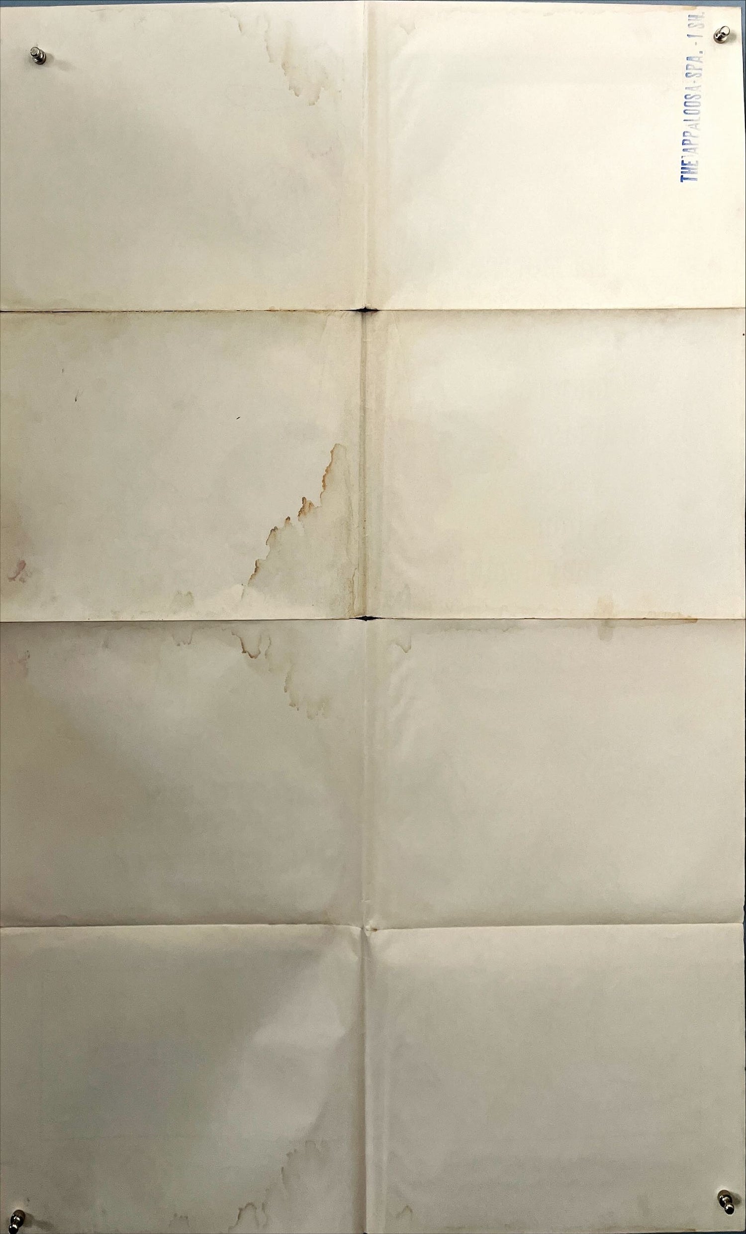 Poster is folded as originally issued. There is visible staining and water damage on the reverse, particularly along the fold lines and lower quadrants. Front image remains vibrant and frameable, though there are signs of slight discoloration near edges. Paper remains structurally intact with no major tears.