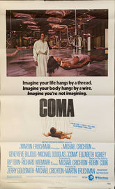Coma, the 1978 Michael Chrichton science fiction (sci-fi) mystery suspense thriller ("Imagine your life hangs by a thread. Imagine your body hangs by a wire. Imagine you're not imagining."; "From the #1 best selling suspense thriller"; "Based on the novel by Robin Cook")