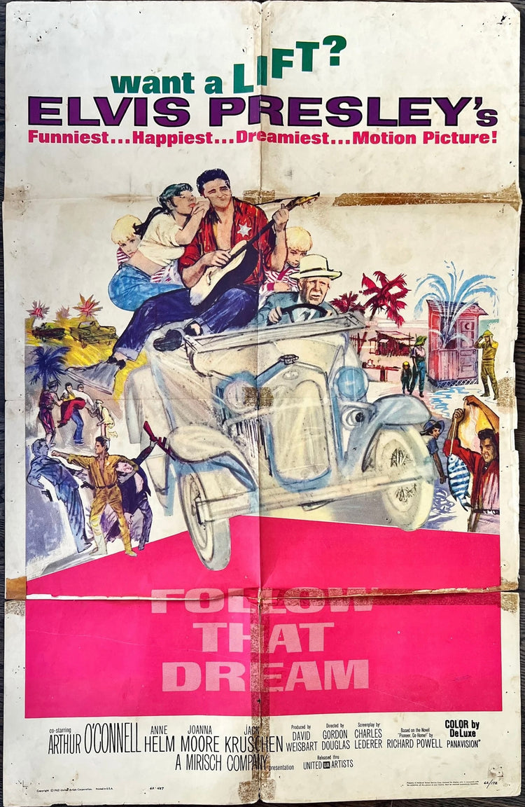 Follow That Dream, the 1962 rock 'n' roll (rock and roll) family romantic comedy musical ("Want a lift? Elvis Presley”s funniest... happiest... dreamiest... motion picture!"; "GO! GO! GO! It's Free-Wheeling Fun!"; "Elvis carries off the surprise comedy performance of the year!"; "Elvis Hits the road to laughter and hits a new high in romance!"; "Join the fun! It's the chase that changed the face of sunny Florida!