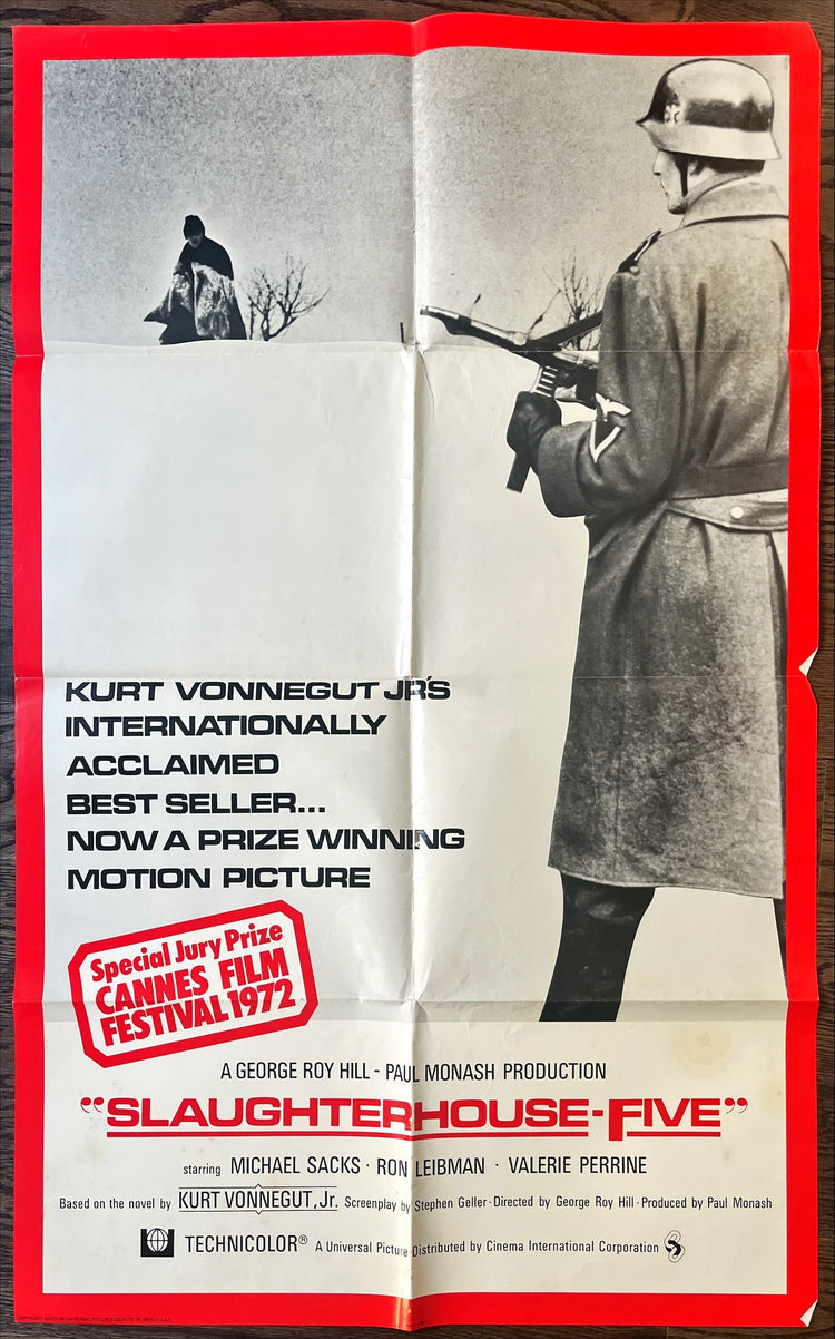 Slaughterhouse-Five, the classic 1972 oscience fiction (sci-fi) World War II (WWII) military fantasy black comedy ("Billy Pilgrim lives from time to time to time..."; ". Now a prize winning motion picture"; "Special Jury Prize Cannes Film Festival 1972"; "Winner 1972 Cannes Film Festival Jury Prize Award Only American Film to be so Honored";
