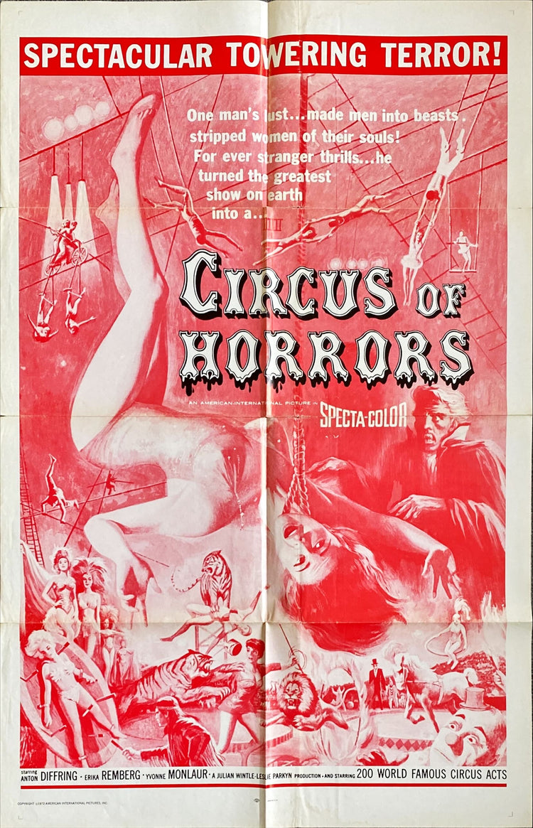 Circus of Horrors, the 1960 Sidney Hayers English circus trapeze horror thriller ("Spectacular towering terror!"; "One man's lust... Made men into beasts... Stripped women of their souls! For ever stranger thrills... He turned the greatest show on earth into a... Whiplash of Terror!"; "See Adam and Eve and the most bizarre circus in the world-"; "The strange thrills... the beauty and blood of the wheel of death."; "The strange thrills... the beauty and blood of the most bizarre circus in the world!"