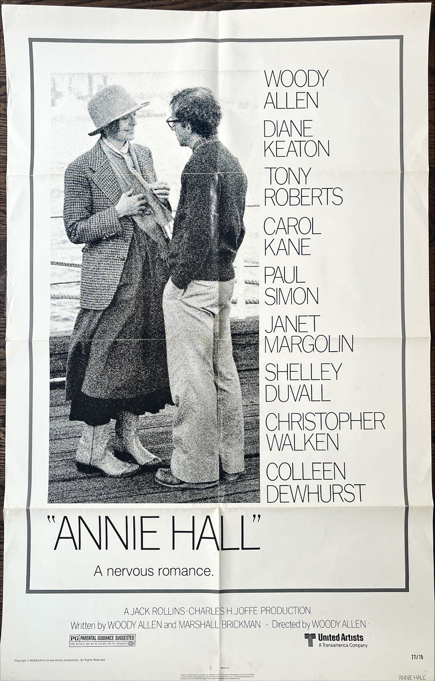 Annie Hall, the 1977 Woody Allen(winner of the Best Director Academy Award for this film) New York City romantic comedy melodrama ("A nervous romance."; "A new comedy.","; winner of the Best Picture Academy Award)