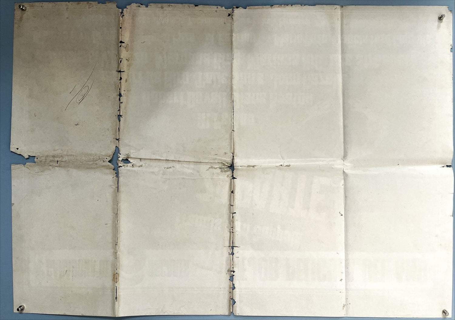 Despite the wear, the print remains bold and complete, with strong display presence. It would benefit from linen backing for preservation and restoration.
