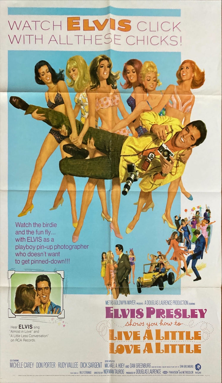 Live a Little, Love a Little, the 1968 romantic photographer rock & roll (rock and roll) musical comedy ("Watch ELVIS click with all these chicks!"; "Watch the birdie and the fun fly... with Elvis as a playboy pin-up photographer who doesn't want to get pinned-down!!!"; "Elvis Presley shows you how to Live a Little Love a Little"; "From dawn to darkroom... from doll to doll... Elvis clicks with the chicks as a playboy photographer who leads a double-life!"