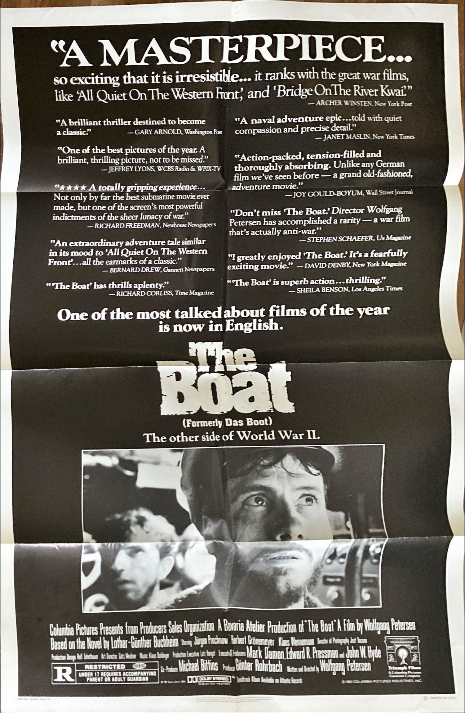 Das Boot (also released as "The Boat", "The Boat [Das Boot]", and "U-boat 96"), the classic 1981 (released in the U.S. in 1982) Wolfgang Petersen (nominated for the Best Director Academy Award for this film) German World War II (WWII) military thriller ("When the hunters become the hunted"; "The other side of World War II"; "The most talked about movie in Germany is coming to America."; "The most talked about movie in Germany is now one of the most talked about movies in America"; "One of the most talked about films of the year is now in English"