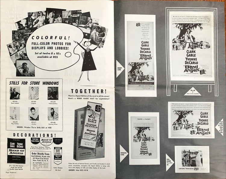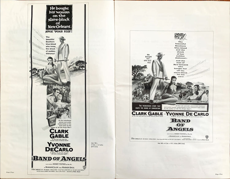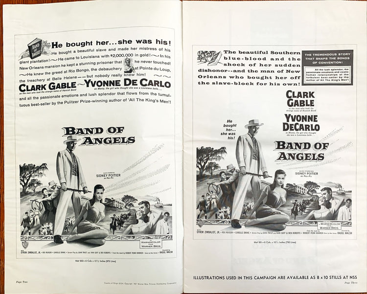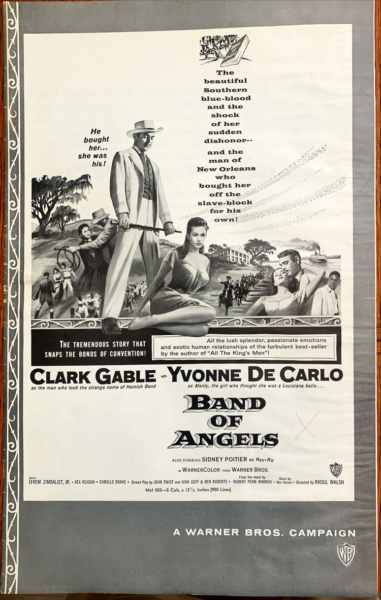 Band of Angels, the 1957 Raoul Walsh Civil War Louisiana historical slavery romantic melodrama ("He bought her - she was his!... A beautiful slave who became mistress of his plantation!"; "He came to the Bayou a vagabond - with $2,000,000 in gold! In his New Orleans mansion he kept a stunning prisoner that he never touched! He knew the greed at Rio Bongo, the debauchery at Pointe du Loup, the treachery at Belle Helene - but nobody really knew him!" starring Clark Gable