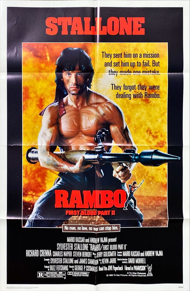 Rambo: First Blood Part 2, the 1985 George P. Cosmatos military Vietnam war action sequel ("They sent him on a mission and set him up to fail. But they made one mistake. They forgot they were dealing with Rambo."; "No man, no law, no war can stop him.