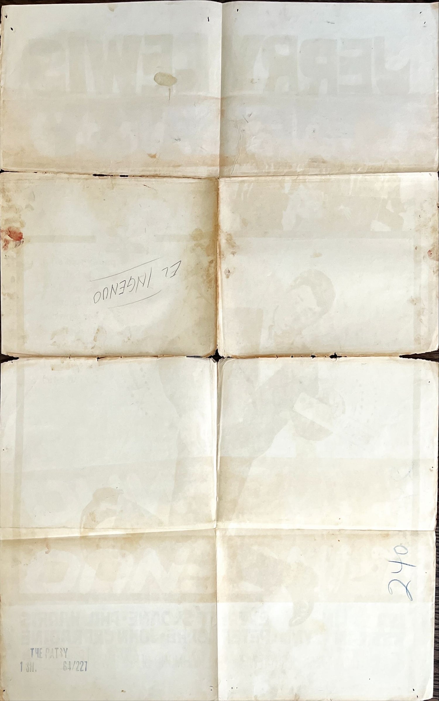 The Patsy (released in Italy as "Jerry 8 3/4"), the 1964 Jerry Lewis (who was also writer and producer) slapstick comedy ("pat'sy [pat'si] n. 1. Fall Guy. 2. Sitting Duck. 3. Schnook. 4. For a precise definition, see: Jerry Lewis as 'The Patsy' [Look under L for lun-a-tic]."