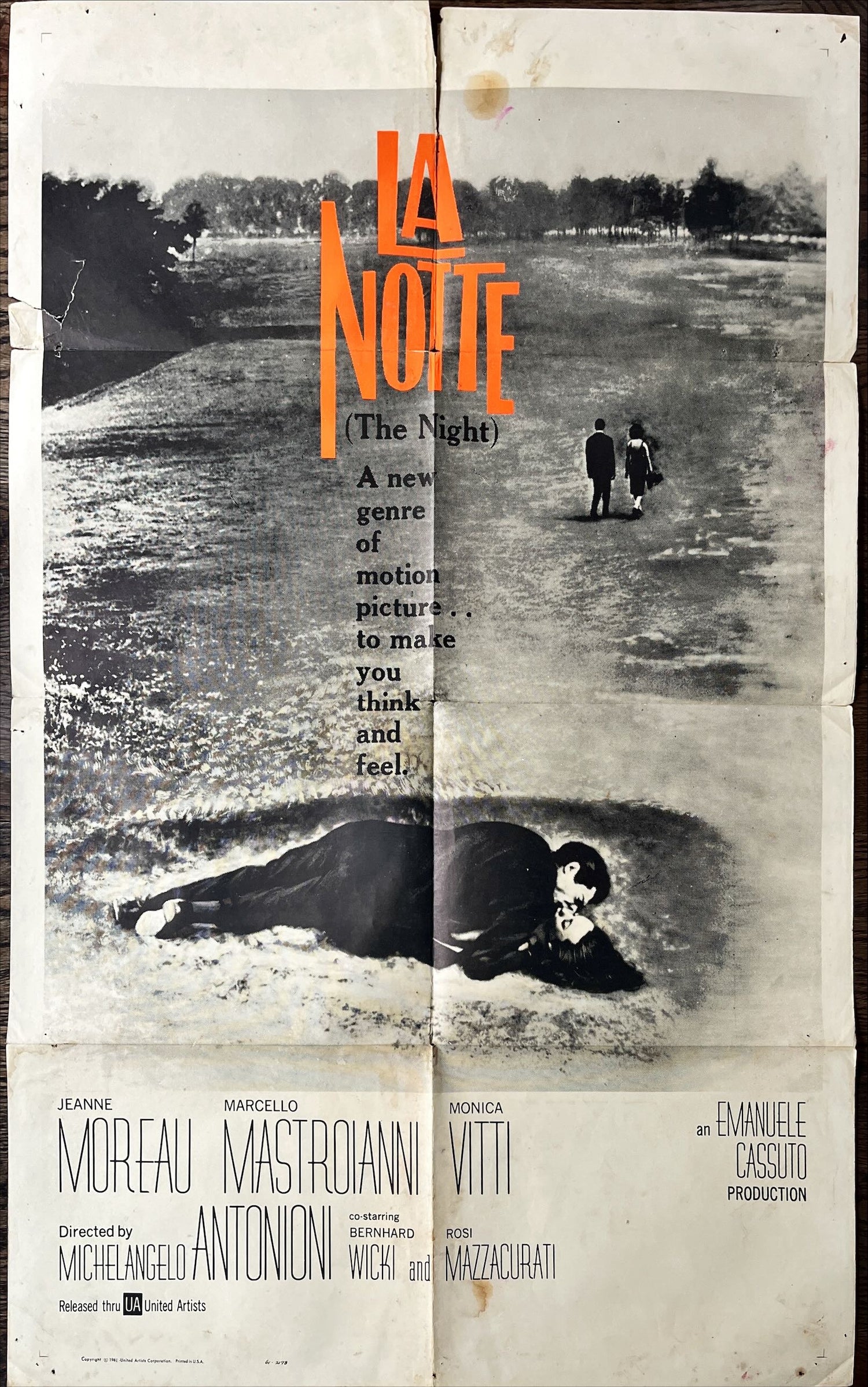 La Notte (released in the U.S. as "La Notte [The Night]" and "The Night [La Notte]"), the 1961 French/Italian estranged-couple romantic melodrama ("A new genre of motion picture ...to make you think and feel") Please refer to pictures for condition details