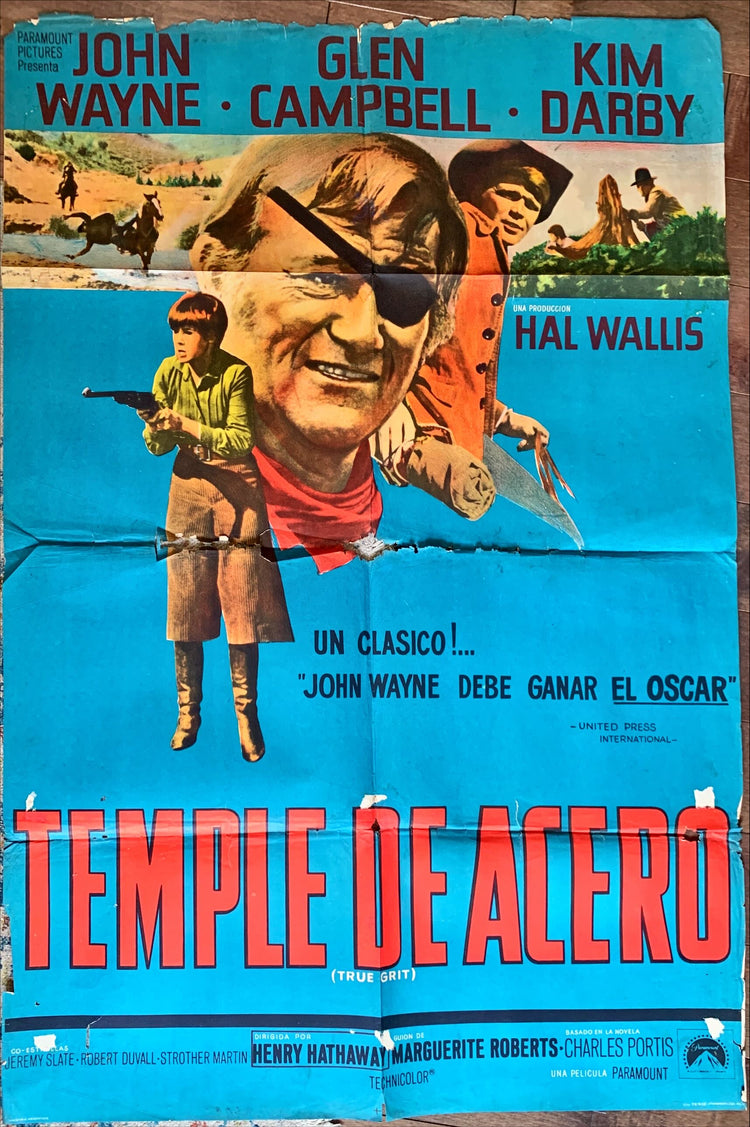True Grit, the classic 1969 cowboy western ("The strangest trio ever to track a killer. A fearless, one-eyed U.S. marshal who never knew a dry day in his life... A Texas ranger thirsty for bounty money... And a girl still wet behind the ears who didn't care what they were or who they were as long as they had true grit."; "A Brand New Brand of American Frontier Story."; "From the novel by Charles Portis")
