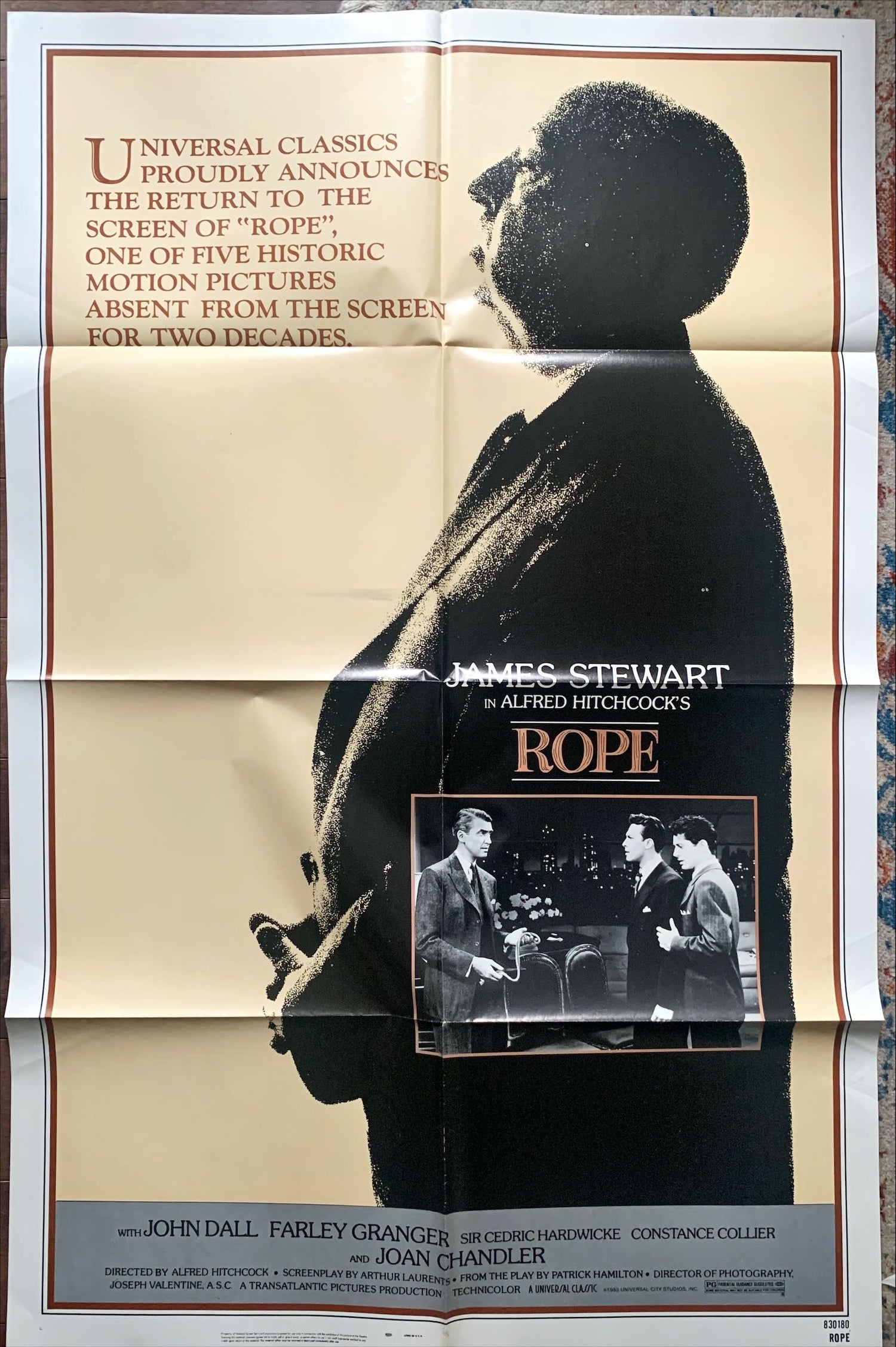 Alfred Hitchcock's Rope (released outside the U.S. as "The Rope"), the classic 1948 Alfred Hitchcock New York City crime murder thriller ("Nothing ever held you like Alfred Hitchcock's ROPE"; "It begins with a shriek, It ends with a shot! From beginning to end nothing ever held you like Alfred Hitchcock's ROPE"; "Screen play by Arthur Laurents"; "From the play by Patrick Hamilton"; loosely based on the Leopold/Loeb child murder trial; this movie had a gimmick in that the entire movie took place in what appears to be one extremely long "take"; to me, it just made it seem like watching a stage play, and took away what differentiates a movie from a stage play!)