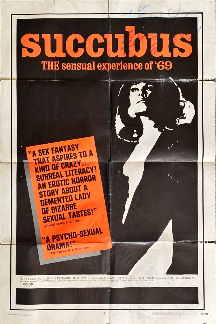 Necronomicon - Getraumte Sunden (released in the U.S. in 1969 as "Succubus" and released in Italy as "Delirium"), the 1968 Jesus Franco (billed as "Jess Franco") German/French sexploitation horror thriller ("THE sensual experience of '69", "This motion picture is rated X adults only, naturally.")