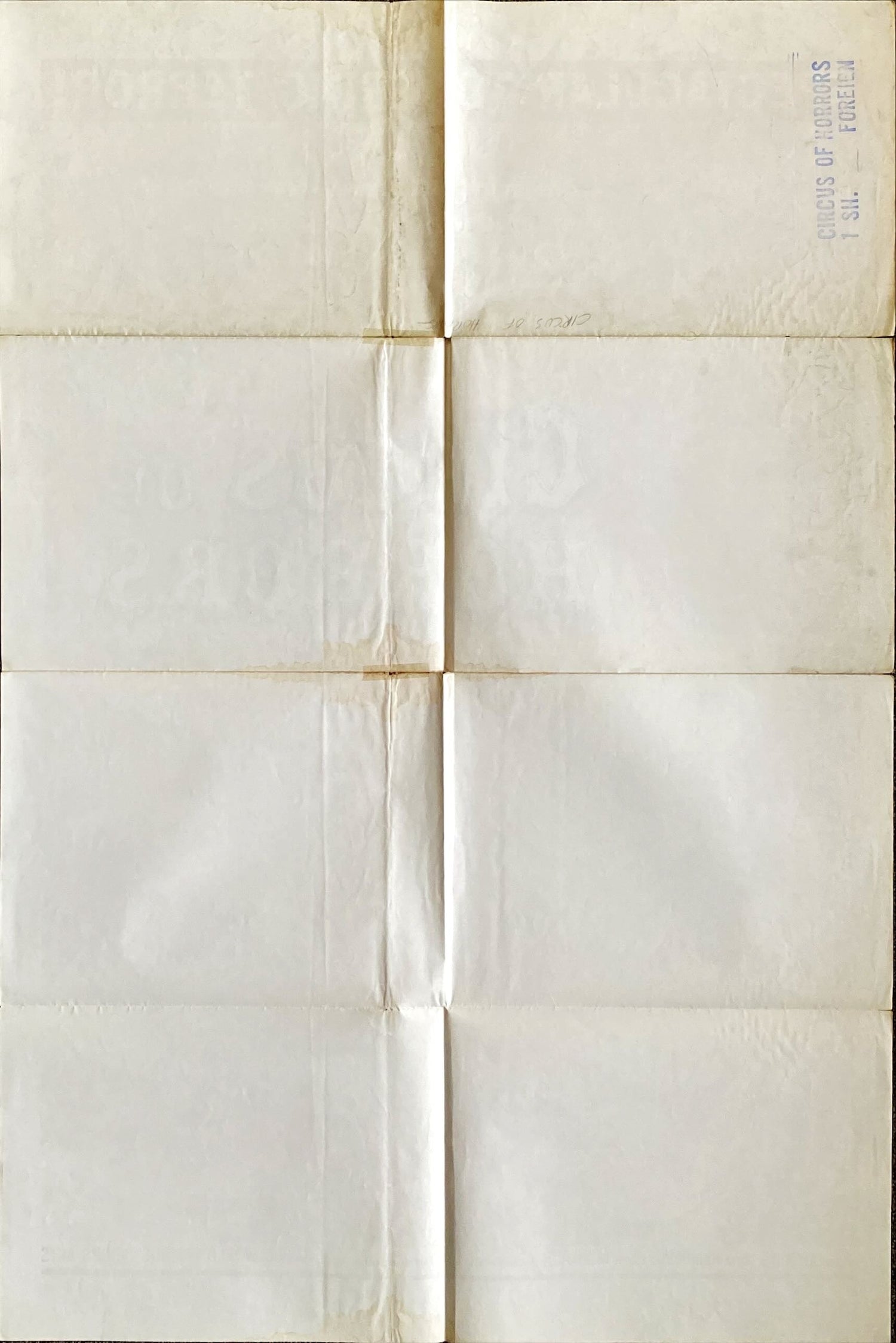 Circus of Horrors, the 1960 Sidney Hayers English circus trapeze horror thriller ("Spectacular towering terror!"; "One man's lust... Made men into beasts... Stripped women of their souls! For ever stranger thrills... He turned the greatest show on earth into a... Whiplash of Terror!"; "See Adam and Eve and the most bizarre circus in the world-"; "The strange thrills... the beauty and blood of the wheel of death."; "The strange thrills... the beauty and blood of the most bizarre circus in the world!"