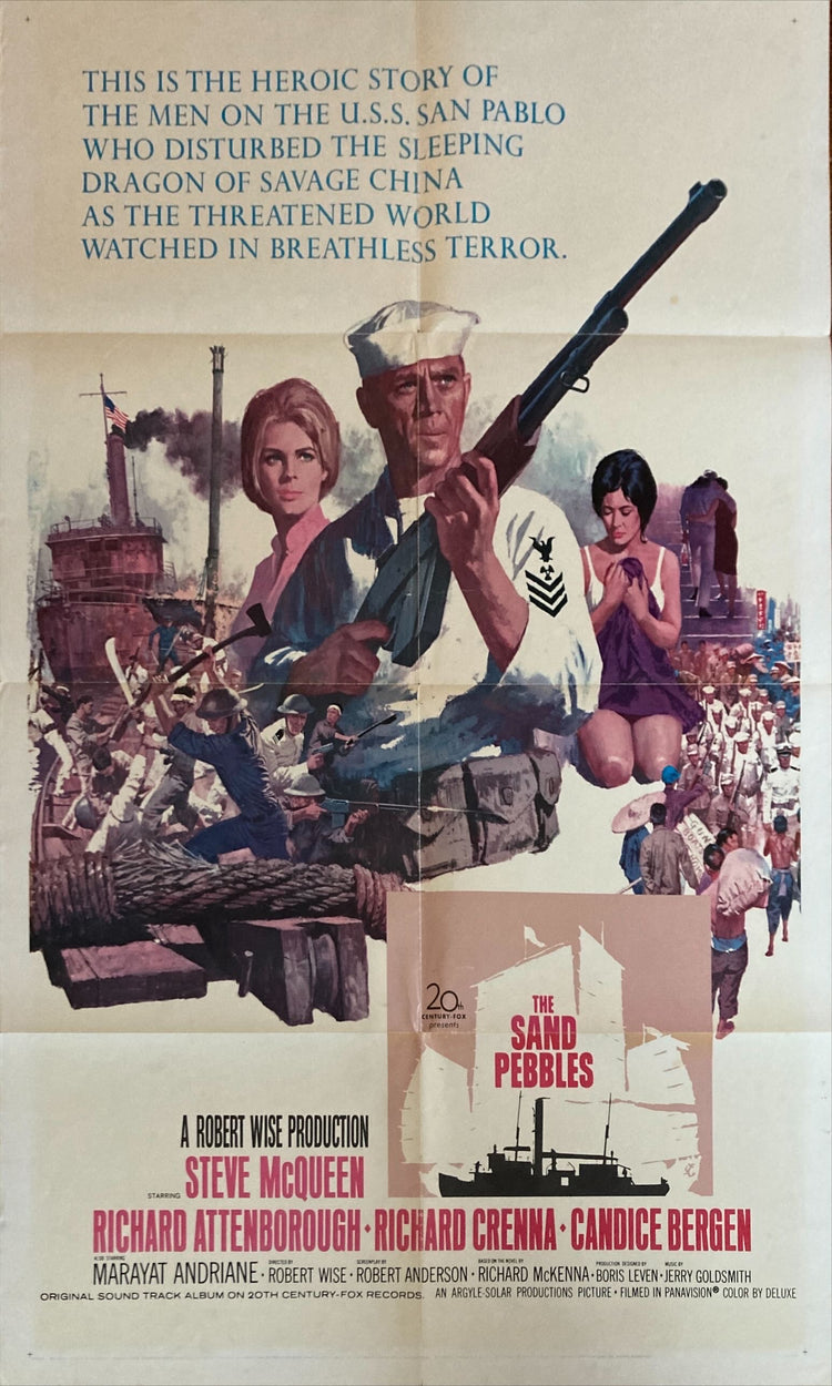The Sand Pebbles, the 1967Naval Navy sailor military China war melodrama ("This is the heroic story of the men on the U.S.S. San Pablo who disturbed the sleeping dragon of savage China as the threatened world watched in breathless terror."; "After 'West Side Story'... 'The Sound of Music'... director Robert Wise now turns his camera on the Orient ...and the world of adventure!"; "Screenplay by Robert Anderson"; "based on the novel by Richard McKenna"; nominated for the Best Picture Academy Award; set in 1926 China; about an American ship that is supposed to be completely neutral, but when some missionaries are treated poorly, one of the sailors takes it on himself to lead a rescue of them)
