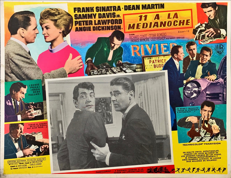 Ocean's Eleven, the classic 1960 Lewis Milestone Las Vegas Nevada Rat Pack multi-million-dollar multi-casino hold-up gambling crime caper thriller ("That Big One!!"; "Nobody else would have dared it because nobody else would have the nerve!"; "You wouldn't call it a gang. Just Danny Ocean and his 11 pals - the night they blew all the lights in Las Vegas!..."; about 11 Army veterans joining together to rob five Las Vegas casinos at once!) starring Frank Sinatra (in the title role as Danny Ocean), Dean Martin, Sammy Davis Jr., Peter Lawford (the preceding were called "The Rat Pack" because they were real-life friends who socialized regularly)