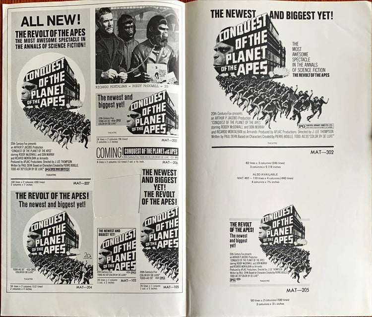 Conquest of the Planet of the Apes, the 1972 J. Lee Thompson science fiction (sci-fi) fantasy intelligent-ape-men thriller sequel ("ALL NEW! The Revolt of the Apes! The Most Awesome Spectacle in The Annals of Science Fiction!"; "The revolt of the apes"; "The newest and biggest yet!"; "Based on characters created by Pierre Boulle"; "Written by Paul Dehn") starring Roddy McDowall, Don Murray, Ricardo Montalban ("as Armando"), Hari Rhodes, and Natalie Trundy