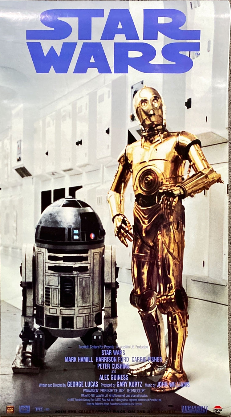Star Wars (now known as "Star Wars: Episode IV - A New Hope"), the classic 1977 George Lucas (nominated for the Best Director Academy Award for this film) outer space fantasy action adventure science fiction (sci-fi) epic ("A long time ago in a galaxy far, far away..."; "George Lucas, the man who brought you American Graffiti now brings you an adventure as big as the cosmos itself: Star Wars, the story of a boy, a girl, and a universe. It's a spectacle light years ahead of its time from 20th Century Fox."