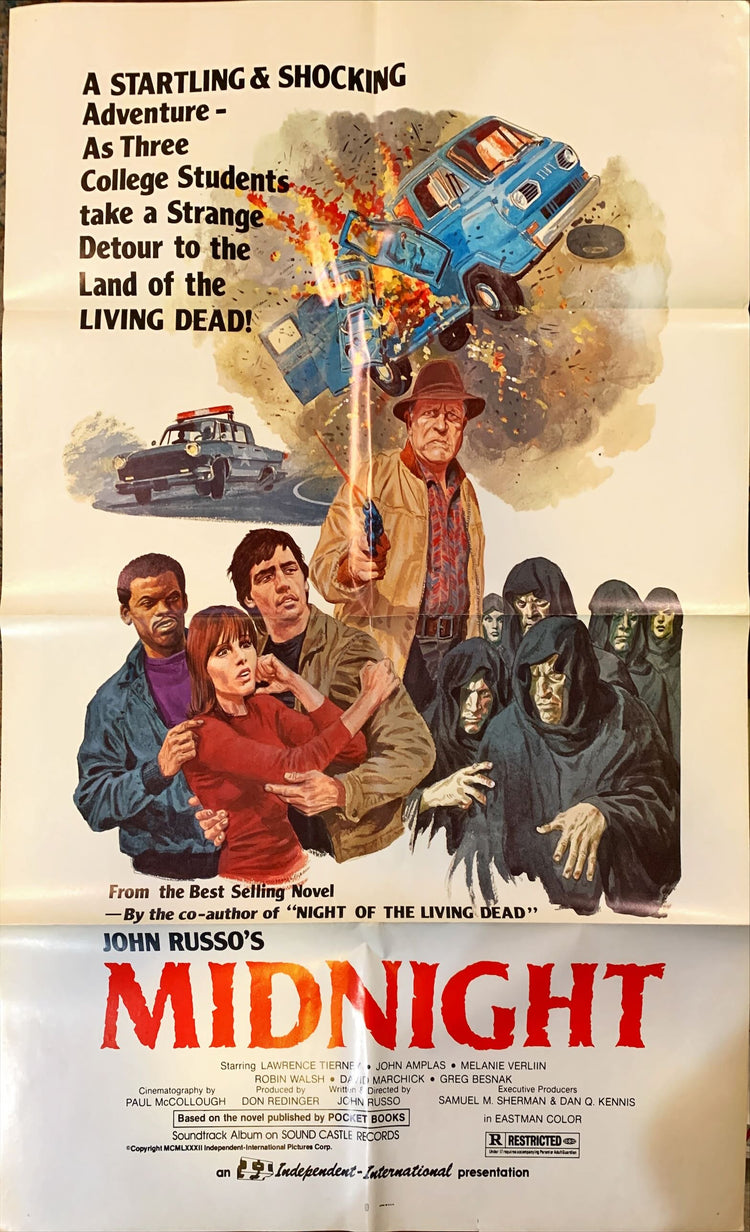 Midnight, the 1982 John Russo (co-author of "Night of the Living Dead") horror thriller ("When the dead drink the blood of the living!"; "It all started as innocent fun until they crossed the county line"; "A startling & shocking adventure - as three college students take a strange detour to the land of the living dead!"; "If you have a weak stomach - don't come!")
