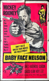 Baby Face Nelson, the 1957 crime film noir ("The deadliest killer of them all!"; "More vicious than Little Caesar! More savage than Scarface! More brutal than Dillinger! The 'Baby-Face Butcher' who lined 'em up - chopped 'em down - and terrorized a nation!"; "SEE! The Chicago Mob Massacre!"; "SEE! Baby Face team up with Dillinger - The deadliest combination in crime annals!"; "SEE! The biggest 48 state Manhunt in history!"; "Don't see it - unless your nerves are bulletproof!"; "It slams you in the guts with a bellyful of lead!"; "Baby Face Nelson ...who was the FBI's Public Enemy No. 1!". PLEASE REFER TO PICTURES FOR CONDITION DETAILS