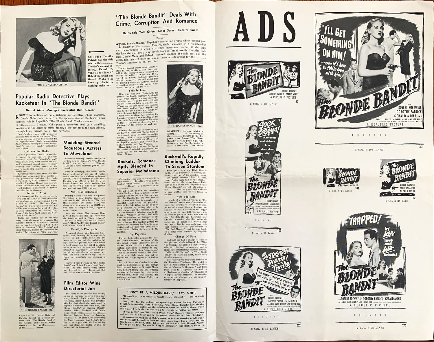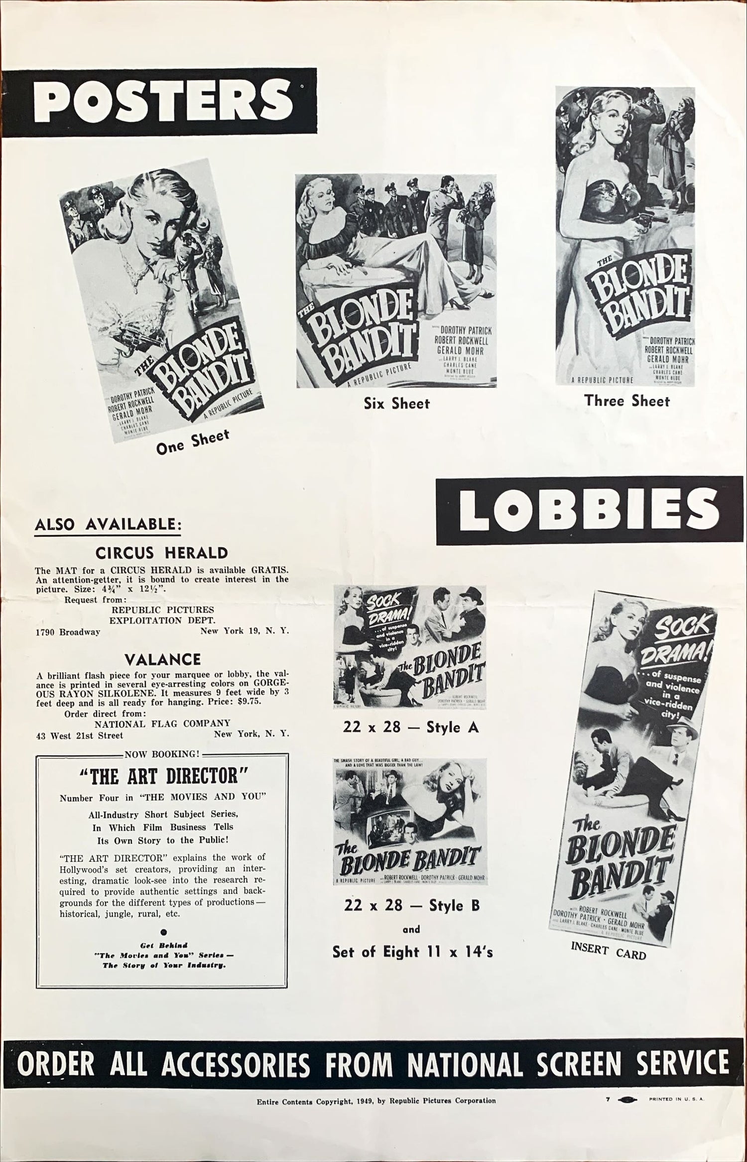 The Blonde Bandit, the 1949 Harry Keller bad girl crime film noir ("SHOCK DRAMA! ...of suspense and violence in a vice-ridden city!"; "Written by John K. Butler"; about a small town woman who goes to a big city to marry a man she corresponded with, but she finds out he is a fake and she keeps getting into deeper and deeper trouble) starring Dorothy Patrick