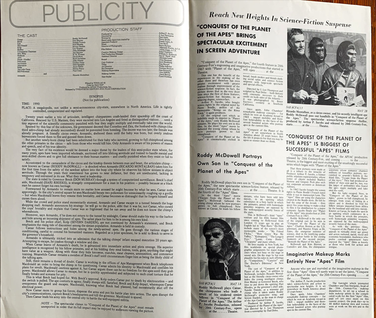 Conquest of the Planet of the Apes, the 1972 J. Lee Thompson science fiction (sci-fi) fantasy intelligent-ape-men thriller sequel ("ALL NEW! The Revolt of the Apes! The Most Awesome Spectacle in The Annals of Science Fiction!"; "The revolt of the apes"; "The newest and biggest yet!"; "Based on characters created by Pierre Boulle"; "Written by Paul Dehn") starring Roddy McDowall, Don Murray, Ricardo Montalban ("as Armando"), Hari Rhodes, and Natalie Trundy