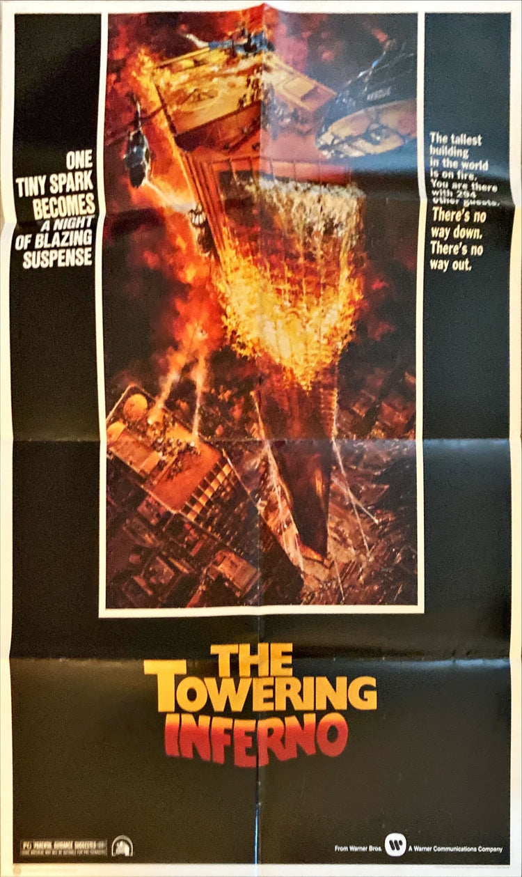 The Towering Inferno, the 1974 John Guillermin San Francisco California disaster suspense thriller ("One Tiny Spark Becomes A Night Of Blazing Suspense"; "One minute you're attending a party atop the world's tallest skyscraper. The next... You're trapped with 294 other guests in the middle of a fiery hell."; "The tallest building in the world is on fire. You are there with 294 other guests. There's no way down. There's no way out."; "Hundreds trapped by flames on 135th floor of World's Tallest building"; "Day of Dedication Becomes Night of Blazing Terror"