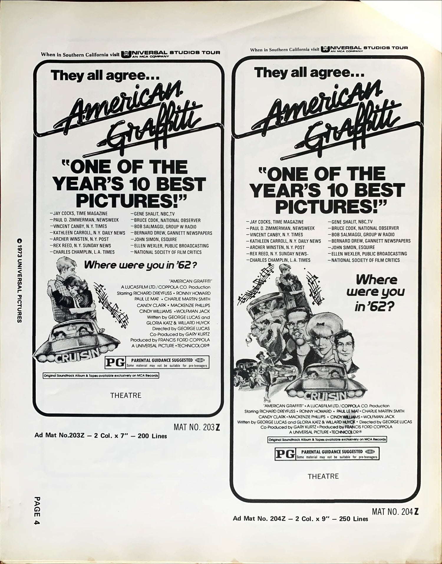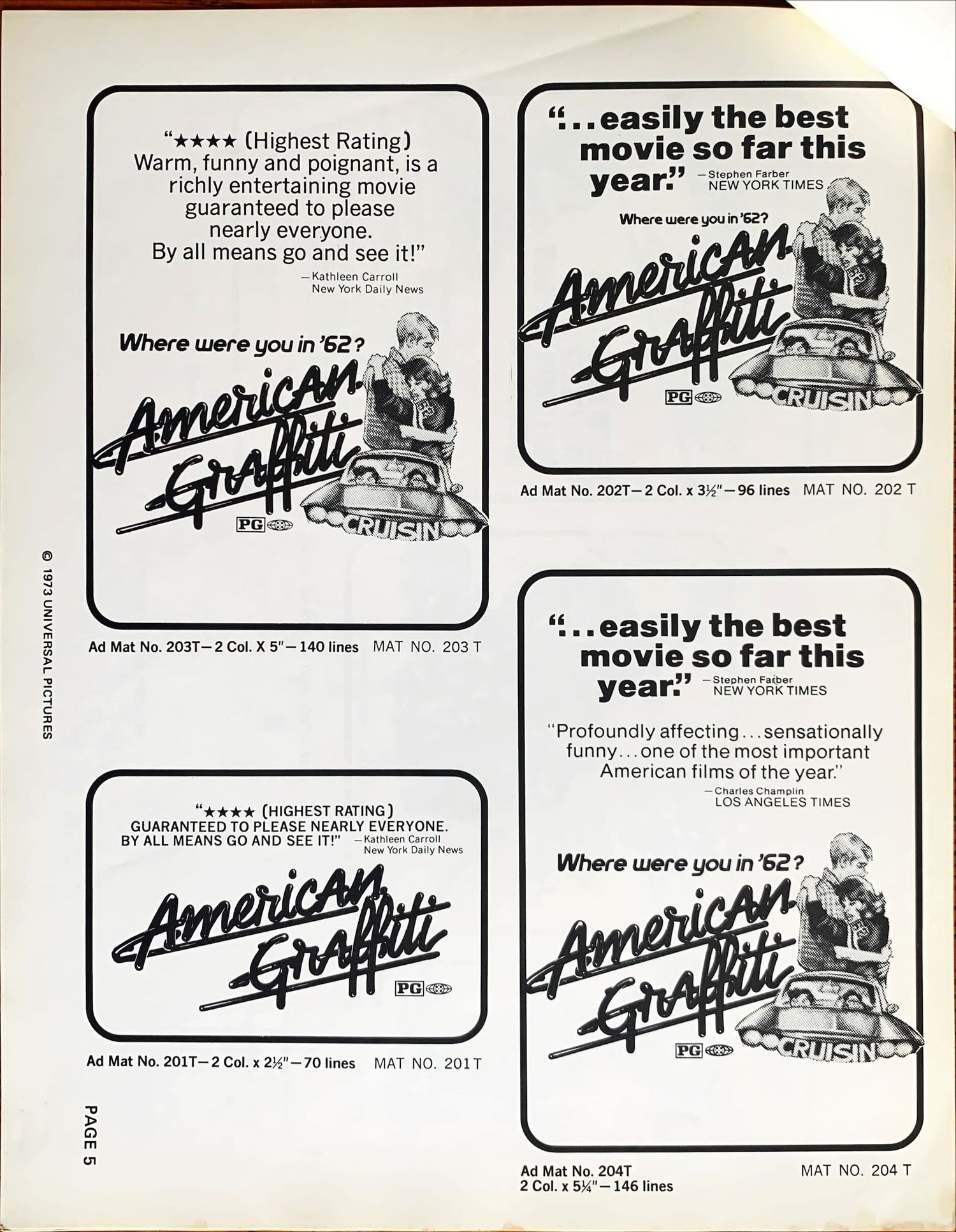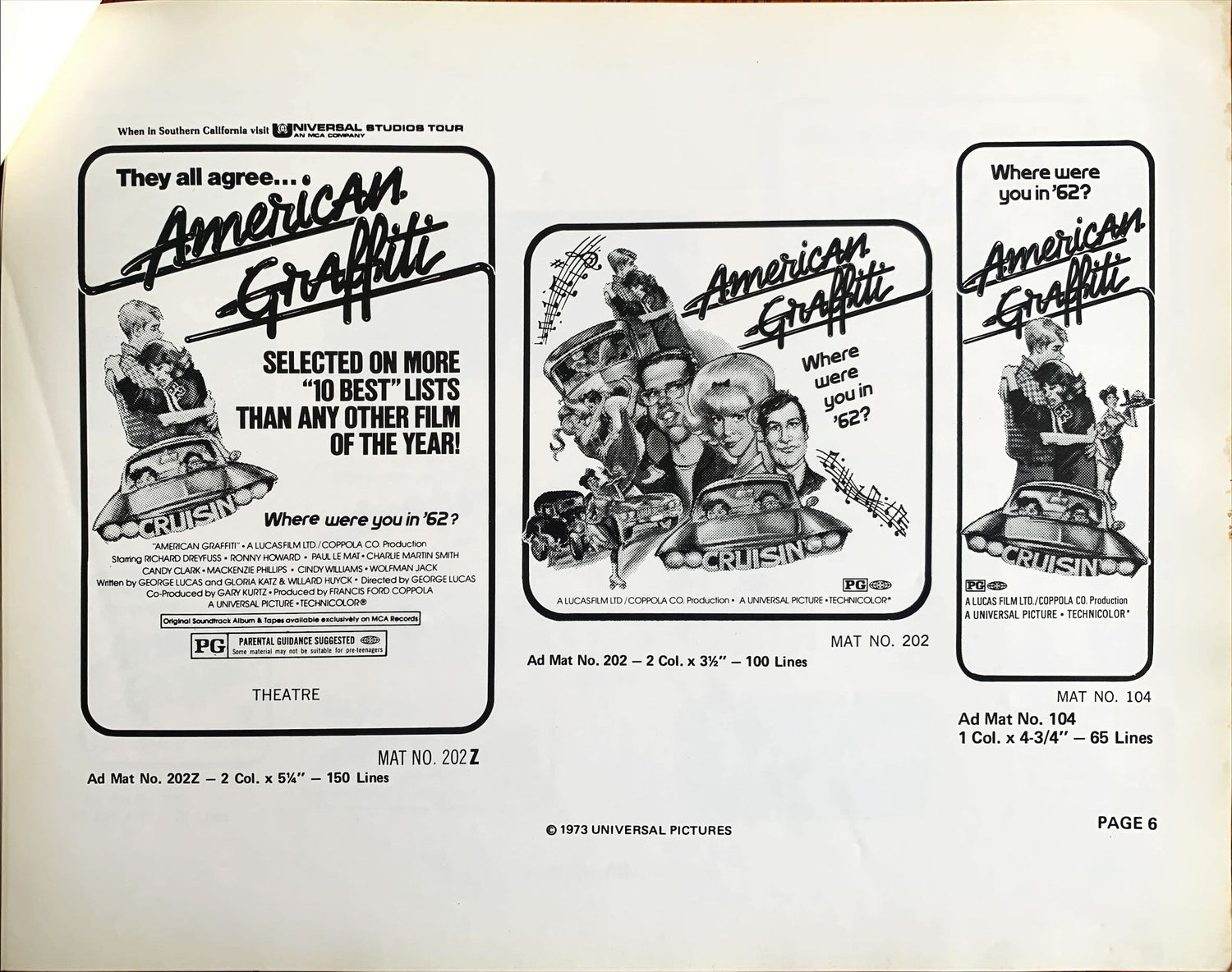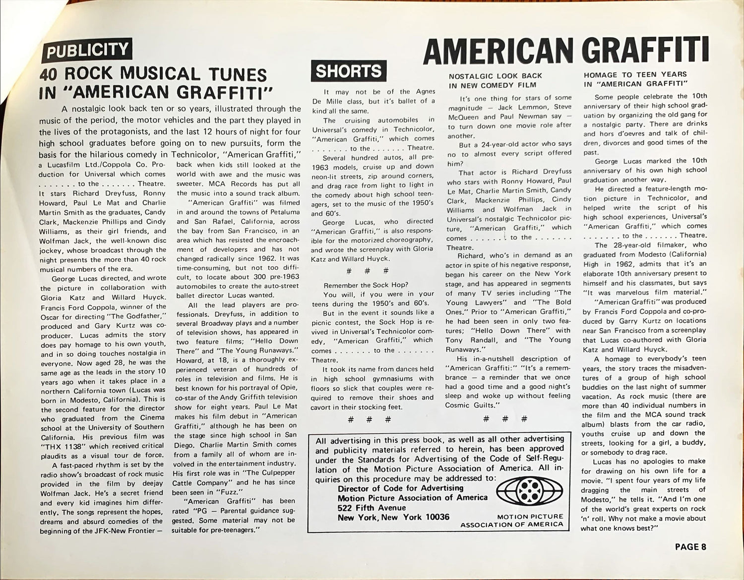 American Graffiti, the classic 1973 George Lucas (nominated for the Best Director Academy Award for this film) teen coming-of-age high school graduation romantic comedy ("Where were you in '62?"; "It was the time of makin' out and cruisin', going steady and playin' it cool it was the time of your life, the time of American Graffiti."; "Written by George Lucas and Gloria Katz & Willard Huyck"; nominated for the Best Picture Academy Award) starring Richard Dreyfuss, Ron Howard