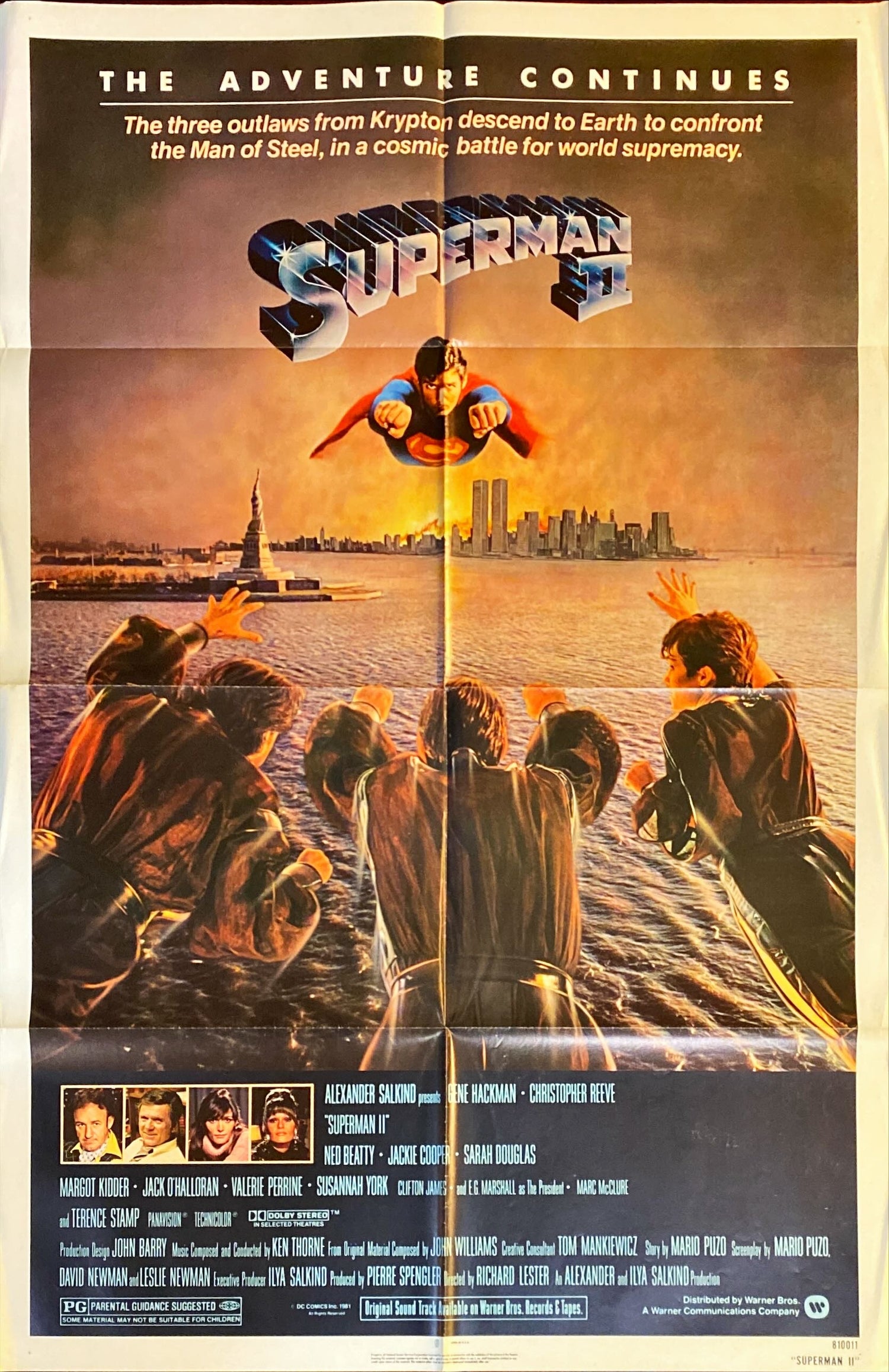 Superman II, the 1980 (released in the U.S. in 1981) Richard Lester English/U.S. comic book superhero science fiction (sci-fi) fantasy sequel ("The Adventure Continues"; "The three outlaws from Krypton descend to Earth to confront the Man of Steel, in a cosmic battle for world supremacy"; "The adventure continues... Miraculously freed from the eternal orbit, the three outlaws from Krypton descended to earth, for the ultimate confrontation"; "If you've only seen the first part, you haven't seen the best part."; "Story by Mario Puzo") starring Gene Hackman (as Lex Luthor), Christopher Reeve (in the title role as Superman/Clark Kent), Ned Beatty, Jackie Cooper (as Perry White), Sarah Douglas, Margot Kidder (as Lois Lane), Jack O'Halloran, Valerie Perrine, Susannah York, Clifton James, E.G. Marshall ("as The President"), Marc McClure (as Jimmy Olsen), and Terence Stamp (as General Zod)