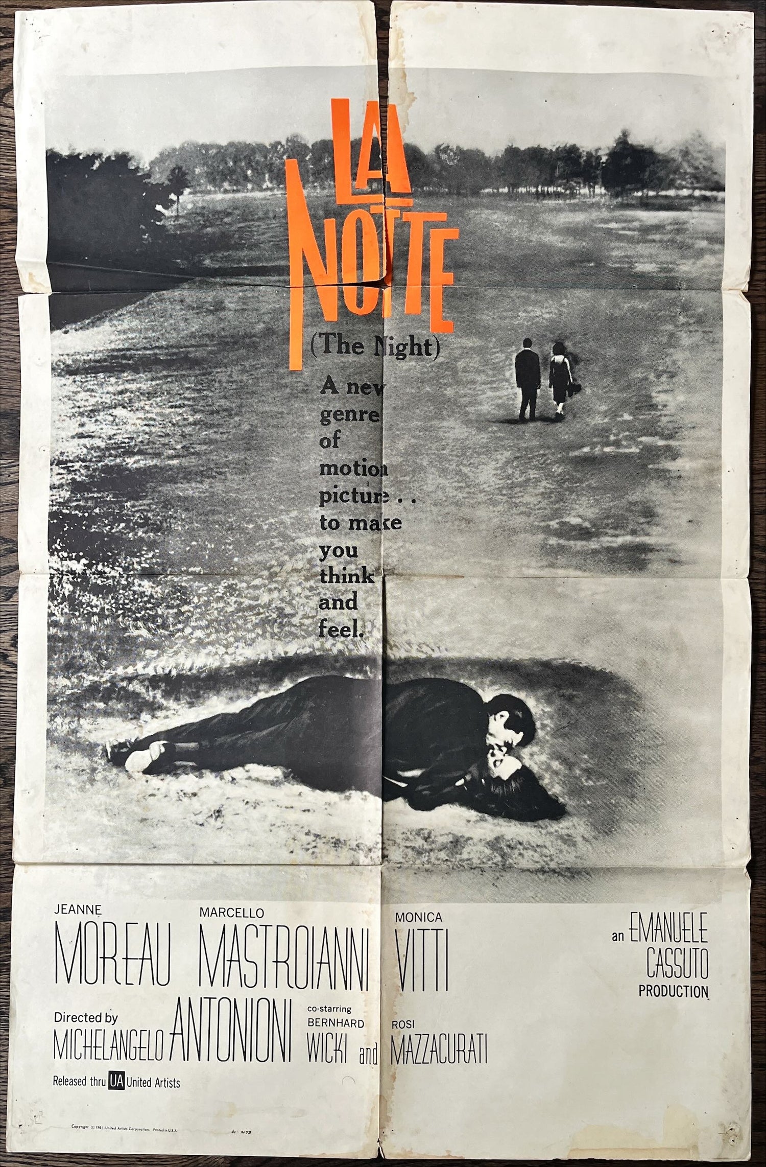 La Notte (released in the U.S. as "La Notte [The Night]" and "The Night [La Notte]"), the 1961 French/Italian estranged-couple romantic melodrama ("A new genre of motion picture ...to make you think and feel"). Please refer to pictures for condition details