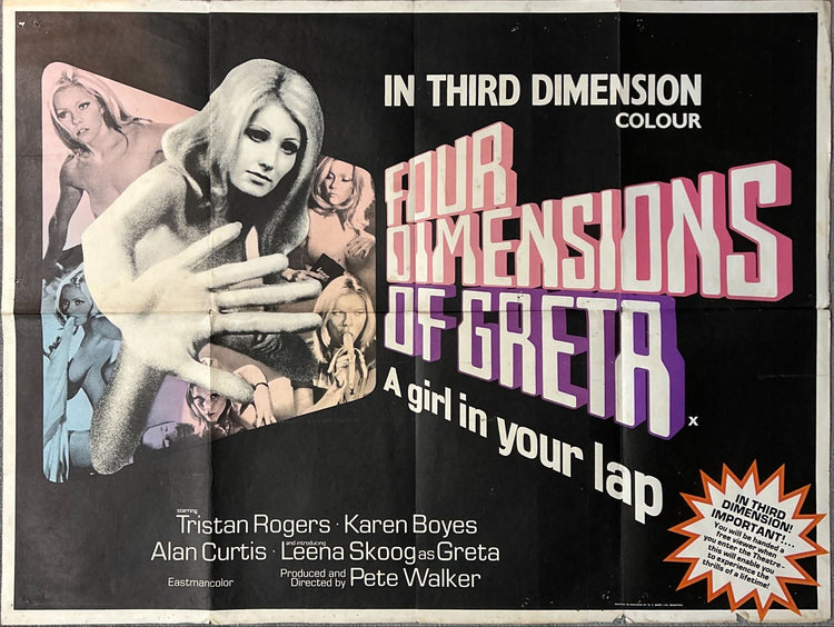 Three Dimensions of Greta (released in the U.S. in 1973 and in other English-speaking countries as "Four Dimensions of Greta"), the 1972 Pete Walker English 3-D (3D; 3-Dimension) sexploitation comedy ("Swing with Greta in 3D") starring Tristan Rogers, Karen Boyes, Alan Curtis, Robin Askwish, and Leena Skoog (in the title role; billed as "Introducing Leena Skoog as Greta")
