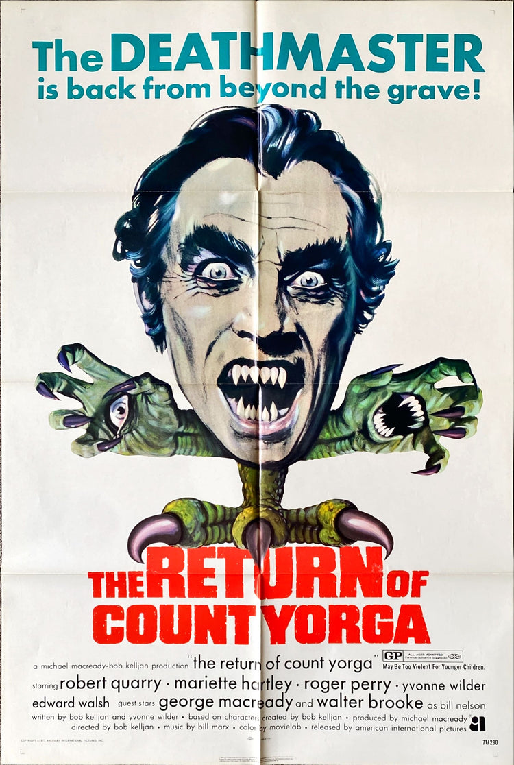 The Return of Count Yorga, the 1971 Bob Kelljan vampire horror thriller sequel ("The Deathmaster is back from beyond the grave!"; "...and Evil will have its finest hour!"; "A terrifying tale of unearthly hungers!"; "Beware of the stare! ...these are the eyes that paralyze."; "May be too violent for younger children"