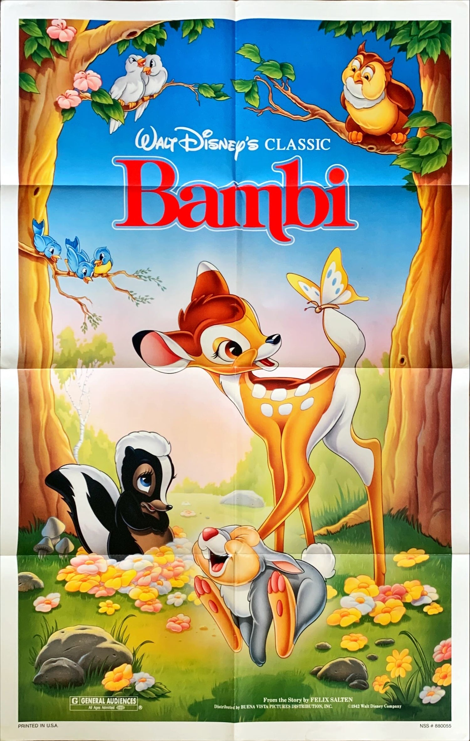Bambi, the classic 1942 David Hand Walt Disney animated animation cartoon family animal deer melodrama about a baby deer and its animal friends' coming-of-age in the forest) featuring the voices of Hardie Albright (in the title role as the voice of the adolescent Bambi), Stan Alexander, Peter Behn, Tim Davis, Sterling Holloway, Paula Winslowe, and Sam Edwards (as the voice of Thumper)