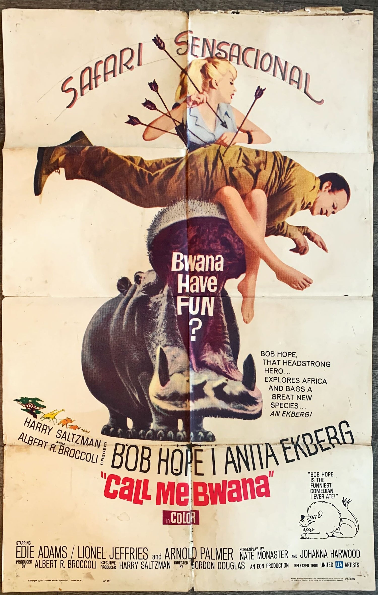 Call Me Bwana, the 1963 Gordon Douglas English/U.S. Africa safari romantic adventure comedy ("Bob Hope, that headstrong hero... explores Africa and bags a new species... an Ekberg!"; "Bwana have fun?"; "Bob Hope is the funniest comedian I ever ate!"; "Hope was never lovelier"; "Ekberg was never funnier!"; "Bob has the natives restless... And Anita dressless!"; "Bwana have fun?"; "Hope invades Darkest Africa with the barest of essentials... food... water... and Anita Ekberg!")