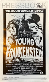 Young Frankenstein (released outside the U.S. as "Frankenstein Junior"), the classic 1974 Mel Brooks monster horror screwball comedy parody ("A Mel Brooks Film"; "Based on characters in the novel 'Frankenstein' by Mary W. Shelley"; "screen story and screenplay by Gene Wilder and Mel Brooks"; a wacky parody of the classic "Bride of Frankenstein")
