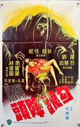 This original Hong Kong poster for Black Magic Part II (directed by Ho Meng-Hua) is a striking and sought-after piece from the golden era of Shaw Brothers horror cinema. Featuring a bold and grotesque hand-painted illustration—a skeletal grim reaper looming over a woman dissolving in a vat of red ooze inside a skull—the artwork exemplifies the outrageous and visceral marketing typical of Asian exploitation horror in the 1970s.