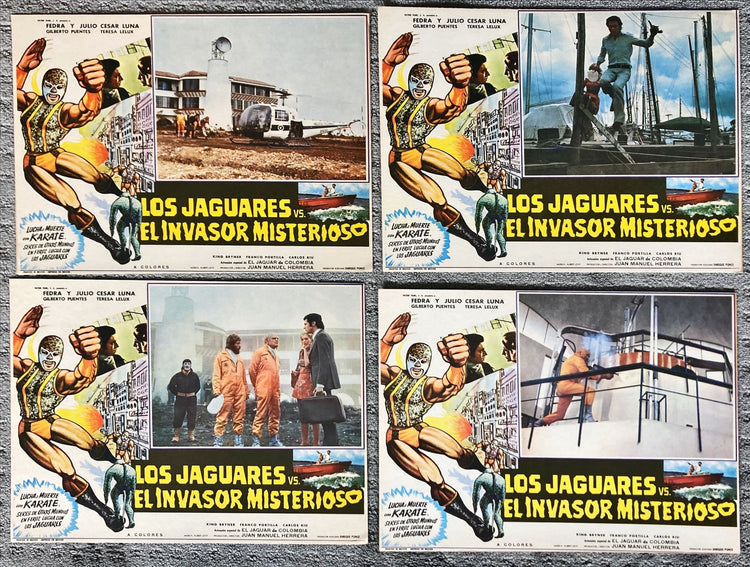 Los Jaguares contra el Invasor Misterioso (literally translates to "Jaguars vs. Mysterious Invader"), the 1975 Juan Manuel Herrera Mexican/Colombian lucha libre luchador masked hero sports wrestling wrestler mystery science fiction (sci-fi) thriller starring Fedra, Julio Caser Luna, Gilberto Puentes, Teresa Lelux, King Bryner, Franco Portilla, and Carlos Riu. It appears this movie was never released in the U.S.