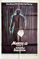 Friday the 13th Part III 3-D (3D; 3-Dimension), the 1982 Steve Miner slasher gory horror sequel ("There is nowhere to hide"; "A New Dimension In Terror...") starring Dana Kimmell, Paul Kratka, Richard Brooker ("as Jason"), Tracie Savage, and Jeffrey Rogers