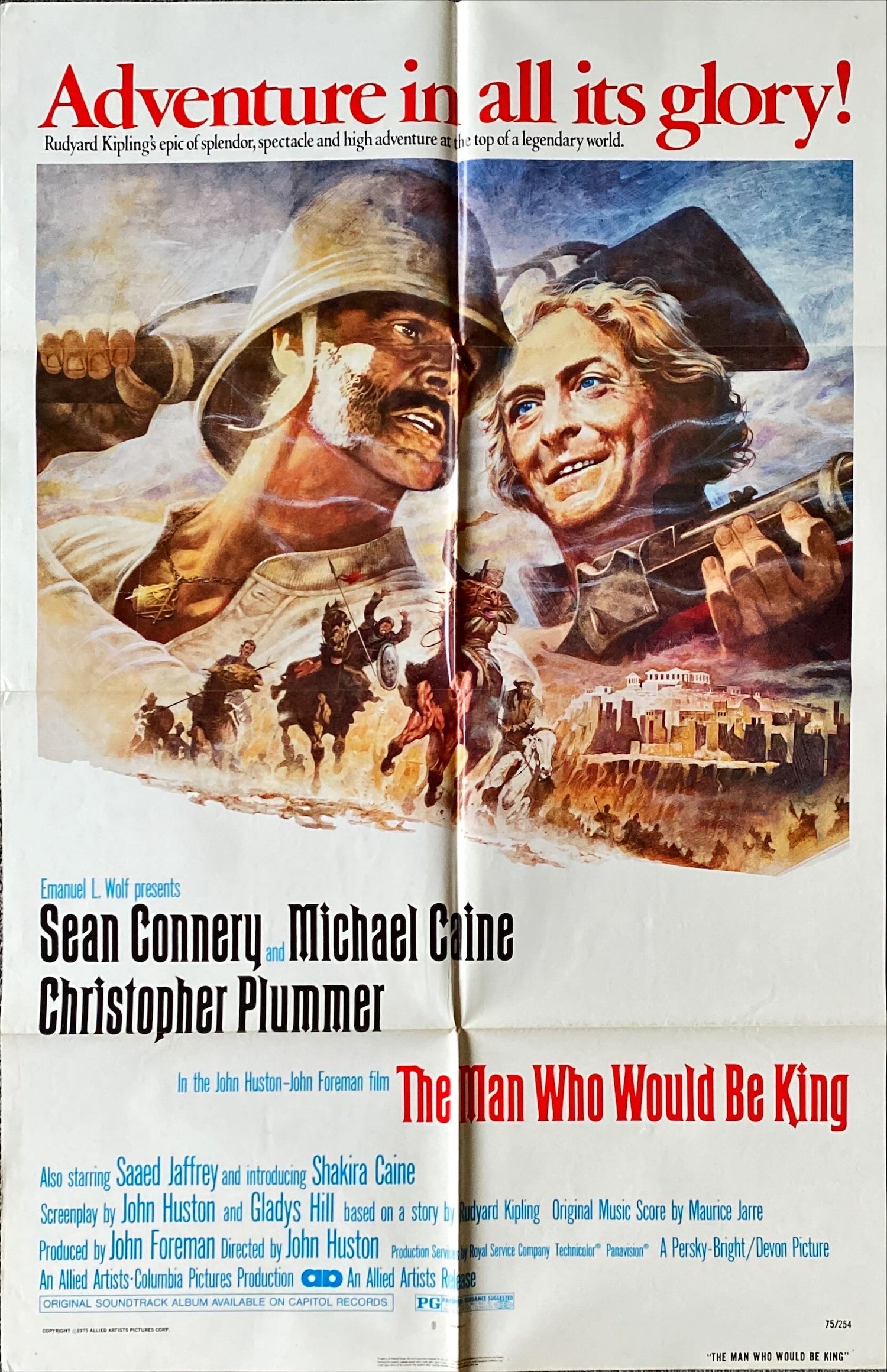 The Man Who Would Be King, the 1975 John Huston English/U.S. British-in-India military war adventure epic ("Adventure in all its glory!"; "Rudyard Kipling's epic of splendor, spectacle and high adventure at the top of a legendary world."; "Long Live Adventure... And Adventurers!"; "Based on a story by Rudyard Kipling"