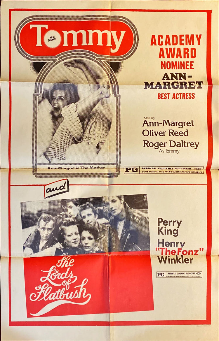From the double-bill release of The Lords of Flatbush, the 1974 Martin Davidson & Stephen Verona New York youth comedy ("When was the last time someone gave you a hickey?"; "It was 1958 when making love meant 'making out'.") starring Henry Winkler, Sylvester Stallone (of "Rocky" & "Rambo") AND Tommy, the 1975 Ken Russell rock 'n' roll (rock and roll) musical melodrama ("Your senses will never be the same."; based on the Pete "The Who" Townshend rock opera) starring Oliver Reed, Ann-Margret (in her nominated for Best Actress Academy Award role), Roger Daltrey, Jack Nicholson, Elton John, Eric Clapton, Tina Turner, John Entwistle, Keith Moon, Paul Nicholas, Robert Powell, Pete Townshend, and Ben Aris