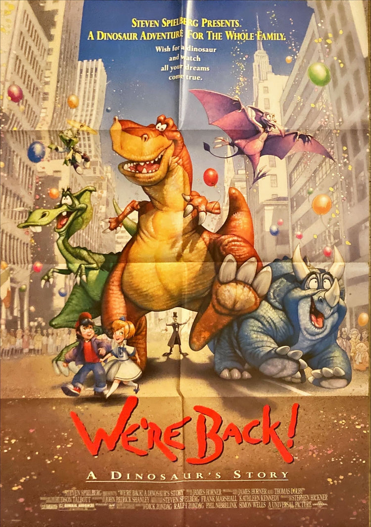 We're Back!: A Dinosaur's Story, the 1993 Phil Nibbelink & Simon Wells animated animation dinosaurs-in-the-present-day family fantasy cartoon ("Steven Spielberg Presents a Dinosaur adventure for the whole family. Wish for a dinosaur and watch all our dreams come true!"; "based on the book by Hudson Talbott")