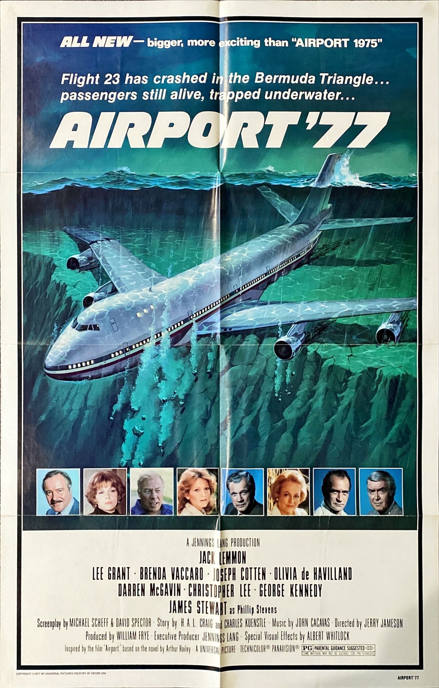 Airport '77, the 1977 Jerry Jameson airplane aviation crash disaster thriller sequel ("ALL NEW - bigger, more exciting than 'Airport 1975'"; "Flight 23 has crashed in the Bermuda Triangle... Passengers still alive, trapped underwater..."; "Inspired by the film 'Airport', based on the novel by Arthur Hailey")
