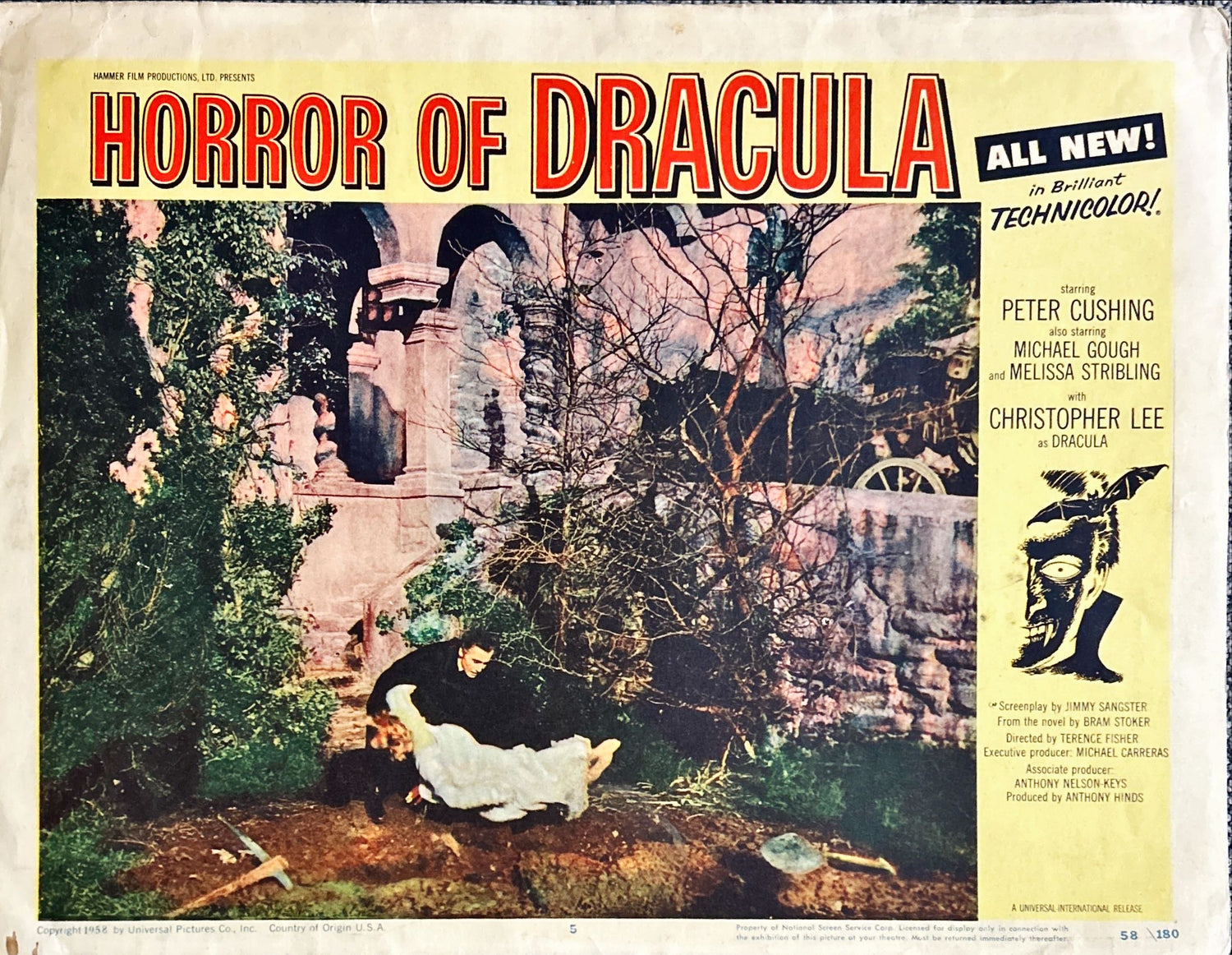 Dracula (released in the U.S. as "Horror of Dracula" and "Dracula 1958"), the classic 1958 Terence Fisher English Hammer vampire horror thriller ("The chill of the tomb won't leave your blood for hours... After you come face-to-face with Dracula !"; "Who will be his bride tonight?"; "The terrifying lover who died... Yet lived!"; "The chill of the tomb won't leave your blood for hours... after you come face-to-face with Dracula !"; "Don't dare see it... alone!"