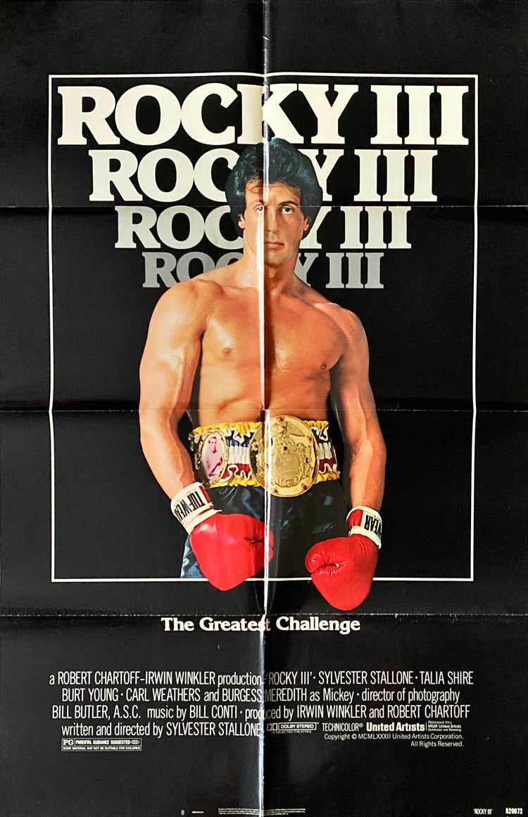 Rocky III, the 1982 Sylvester Stallone boxing sports action melodrama sequel ("The Greatest Challenge"; "The Excitement...The Power...The Man..."; "A Fighter. A Lover. A Legend.")
