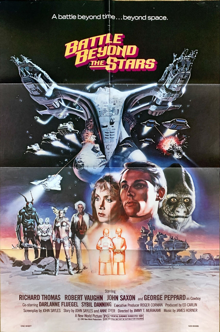 Battle Beyond the Stars, the 1980 Jimmy T. Murakami science fiction (sci-fi) action adventure thriller ("A battle beyond time... beyond space."; "Rebels. Outlaws. Mercenaries. Seven magnificent warriors join to fight the... 'Battle Beyond the Stars'"; "Screenplay by John Sayles"; "Story by John Sayles and Anne Dyer") starring Richard Thomas, Robert Vaughn, John Saxon, George Peppard ("as Cowboy"), Darlanne Fluegel, and Sybil Danning