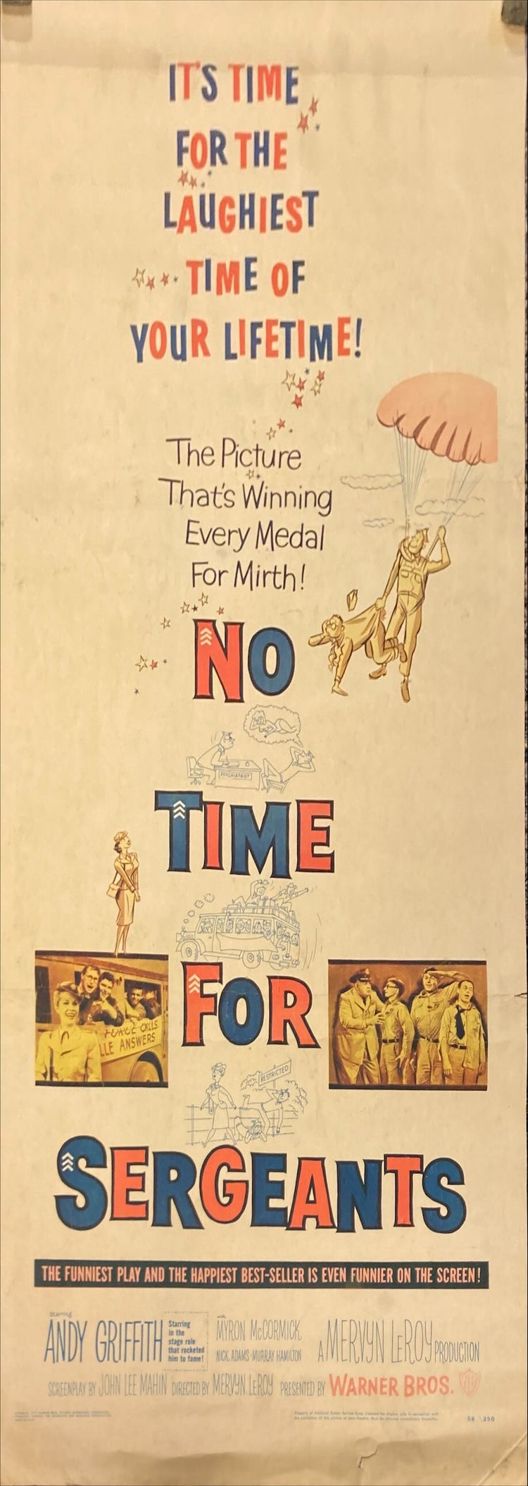 No Time For Sergeants, the 1958U.S. Air Force military slapstick comedy ("The funniest play and the happiest best-seller is even funnier on the screen!"; "The Wonderful guys who won a medal for strictly nothing --and win a Laugh for strictly everything they do! From the same studio and director that gave you 'Mister Roberts' - AND EVEN FUNNIER!"; "The picture that's winning every medal for mirth!"; "Screenplay by John Lee Mahn"; about a country bumpkin who joins the military, and outsmarts all the "city folk"; years later, the basic plot would be borrowed for "Gomer Pyle", which was a spin-off from "The Andy Griffith Show")