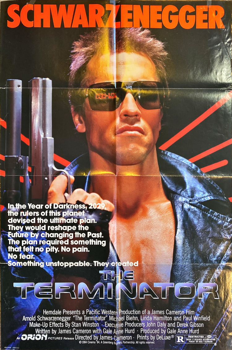 The Terminator, the classic 1984 James Cameron English/U.S. futuristic science fiction (sci-fi) cyborg action adventure horror thriller ("In the Year of Darkness, 2029, the rulers of this planet devised the ultimate plan. They would reshape the Future by changing the Past. The plan required something that felt no pity. No pain. No fear. Something unstoppable. They created 'The Terminator'